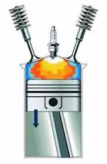 Bilder: Bilde 1 (fra Ford) viser ideelt sett hva som skjer når en gnist fra en tennplugg antenner en blanding av luft og forstøvet bensin slik at blandingen blir glohet og utvider seg og driver stemplet.