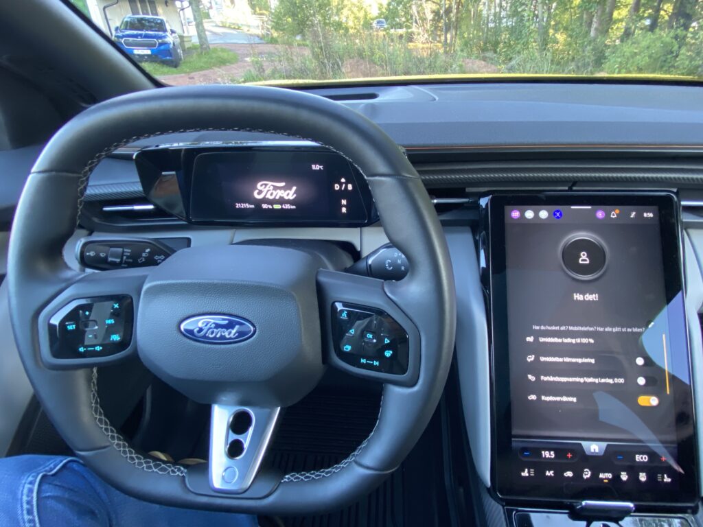 Den lille skjermen med nøkkelopplysninger rett foran føreren fungerte også bra. Flere funksjoner kan betjenes med knapper på rattet, og Ford har heldigvis valgt å markere med symboler hva disse knappene skal brukes til – forbilledlig, synes vi, sammenlignet med umerkede knapper som må identifiseres og betjenes via stor skjerm.