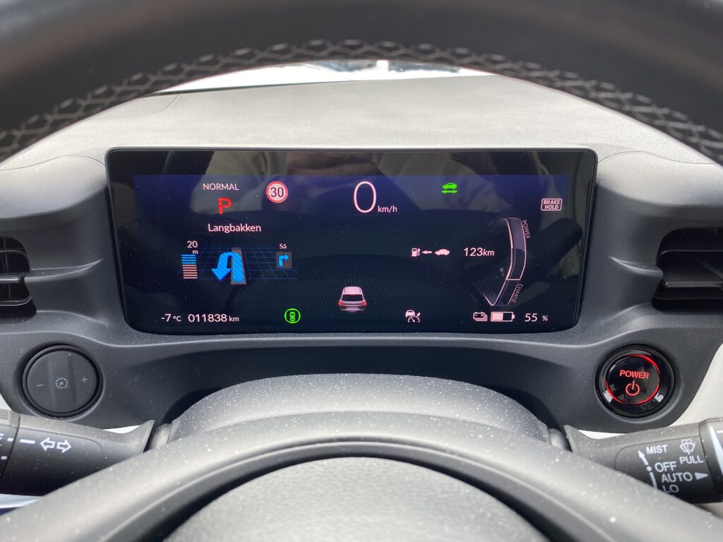 Førerplassen i Honda e:NY1 står seg godt mot konkurrentene, ikke minst i lys av den svært gunstige prisen for bilen. Også fra førersetet fikk vi en klar mye-for-pengene-følelse. Selve setet er bra, og det er god sikt i alle retninger. Panelet rett foran rattet gir det meste man ønsker seg av aktuell informasjon for kjøreturen, så som batterikapasitet, rekkevidde, hastighet og gjeldende fartsgrense på stedet. Det siste bør man likevel være litt forsiktig med å stole blindt på – også i Hondaen blingser skiltleserautomatikken innimellom.