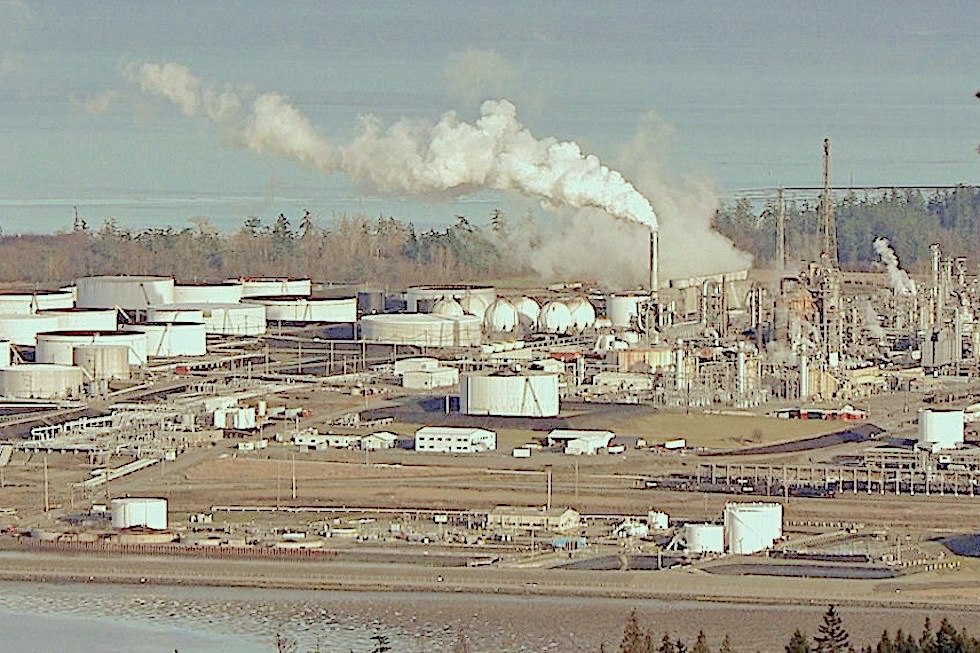 Om det blir storskala utvinning av drivstoff basert på kull (og/eller flis) kan anleggene bli som dette, Shells moderne senter i Anacortes nordvest i USA. Moderne petrokjemiske anlegg kan fange inn CO2 og binde gassen – og lagre den i tette reservoarer som de under Nordsjøen, der Norge nå lagrer CO2 i Utsirafeltet. (Foto: Shell)