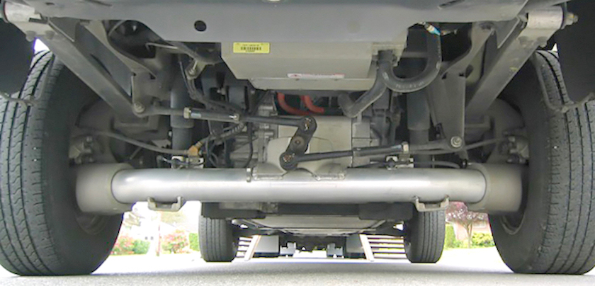 Slik ser greve de Dions elegante løsning ut, tverrkoblingen i Ford Bronco. Det gir god kontroll over bakhjulene. Røret har stor diameter – stivheten øker med diameteren (i tredje potens). Noen løsninger hadde massivt stag, et rør er lettere og MYE stivere per kilo. (Foto: Ford)