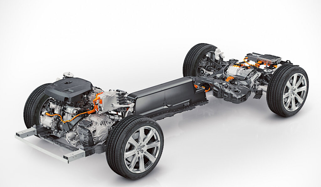 Slik ser en moderne elbils «chassis» ut, noen ganger (ikke her) gir en batterikasse i full bredde stivhet i alle tre akser (x, y og z), opplegget støttes av innpressinger i karosseriets gulv og av søyler mot tak. (Foto: Volvo Personvagnar)