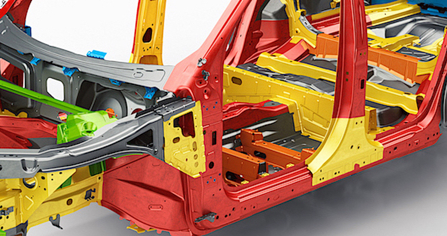 Det er krevende å få full vristivhet med en enkel plateplattform, så denne støttes vertikalt med pressede profiler (søyler) og gir sammen med takets avstivere et 3D bur. Løsningen kan være en «perimeterramme» som Volvo kaller det, eller ha en sentral rørkonstruksjon, en robust ryggrad.